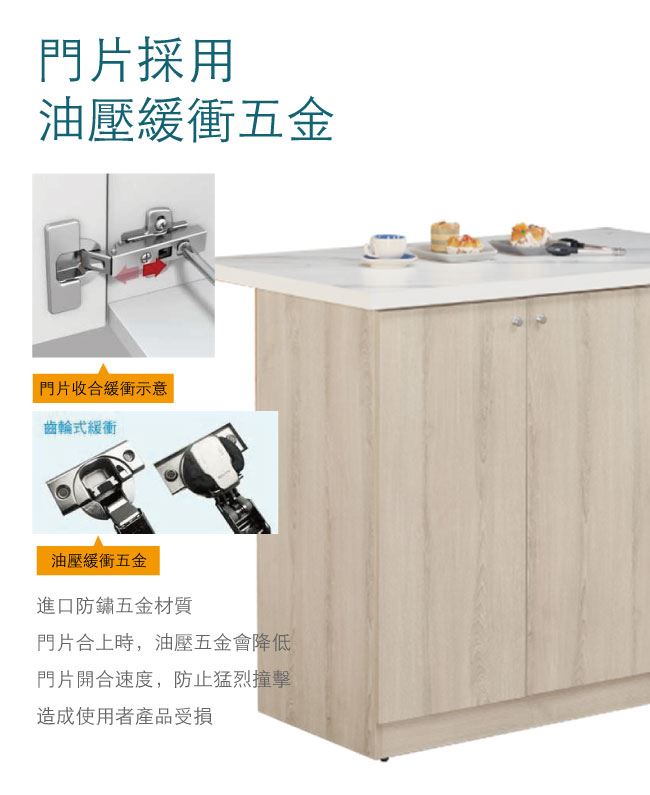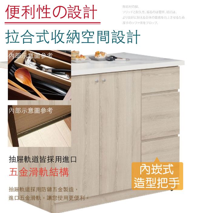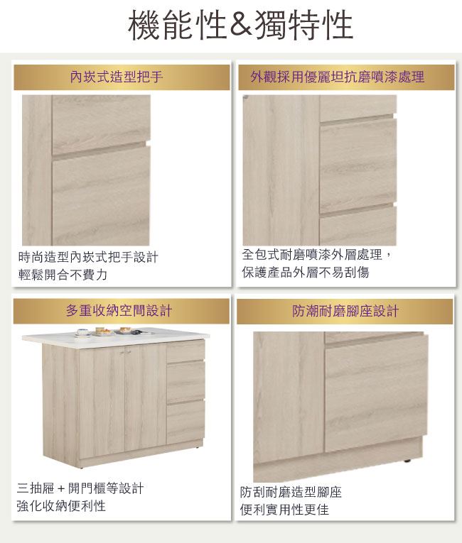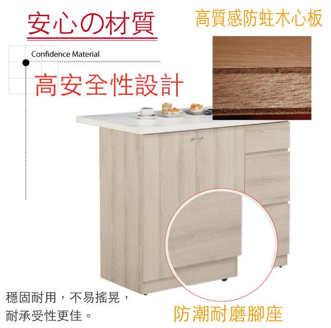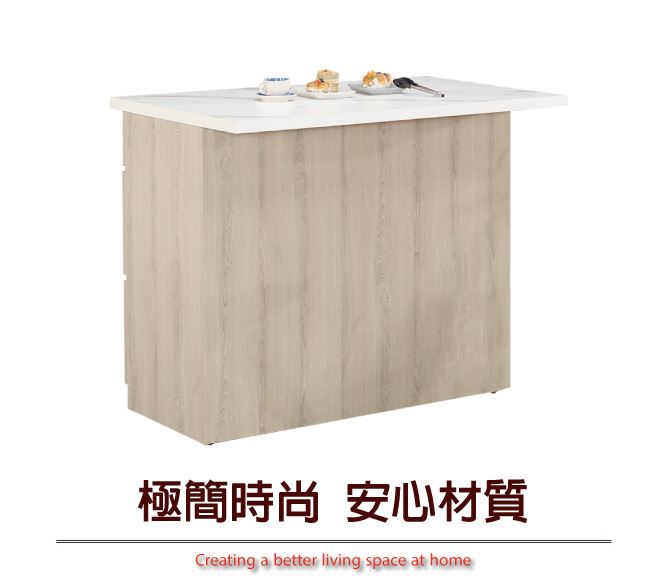 材質 | ◆產品名稱:【綠家居】扎爾 雙色4尺二門三抽餐櫃/中島餐桌 尺寸:(寬)121x(深)70x(高)94/公分 ◆材質: 材質:防蛀木心板+五金滑軌結構+防潮耐磨腳座+防夾手緩衝門片五金+仿石面紋木質桌面板 |