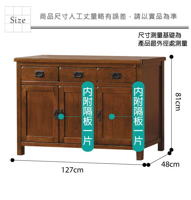 材質 | ◆產品名稱: 【綠家居】特馬爾 淺胡桃4.2尺實木三門餐櫃 尺寸:(寬)127x(深)48x(高)81/公分 ◆材質: 材質:松木實木+防潮耐磨腳座+五金滑軌結構+防夾手緩衝門片五金 噴漆:防潮耐磨噴漆處理
