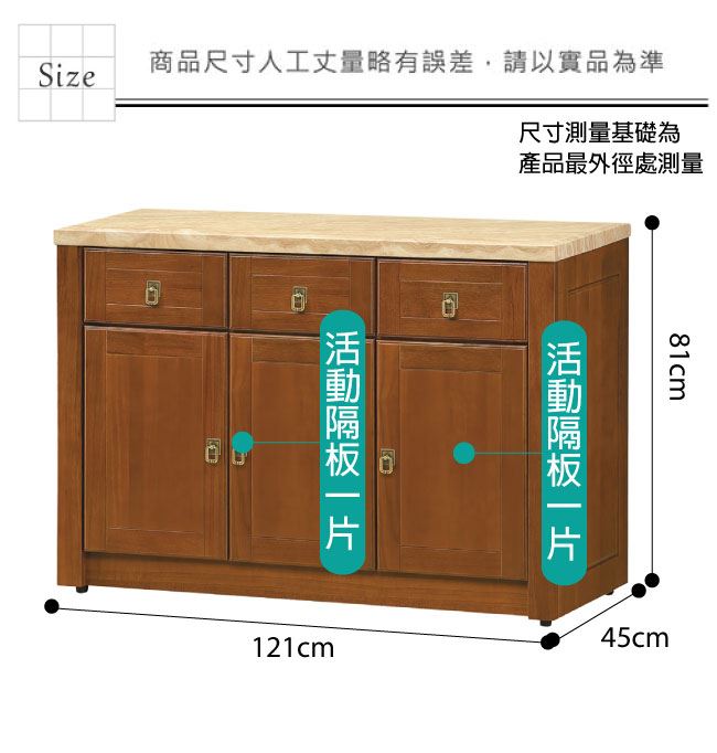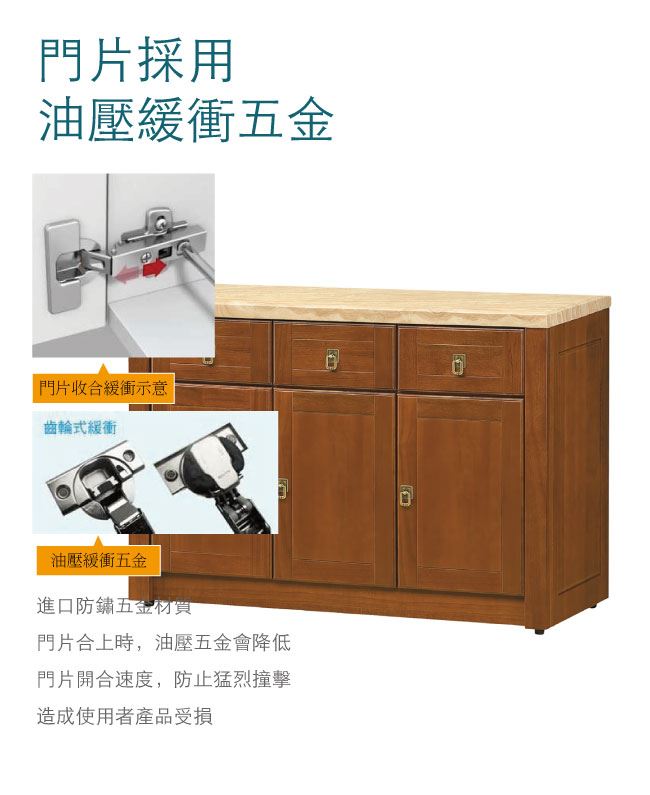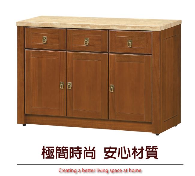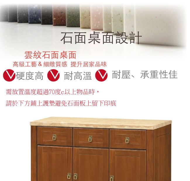材質 | ◆產品名稱: 【綠家居】布塞爾 樟木紋4尺雲紋石面實木餐櫃 尺寸:(寬)121x(深)45x(高)81/公分 ◆材質: 材質:樟木實木+松木實木+防蛀木心板+防潮耐磨腳座+五金滑軌結構+2cm雲紋石面板+防夾手緩衝門片五金 噴漆:防潮耐磨噴漆處理