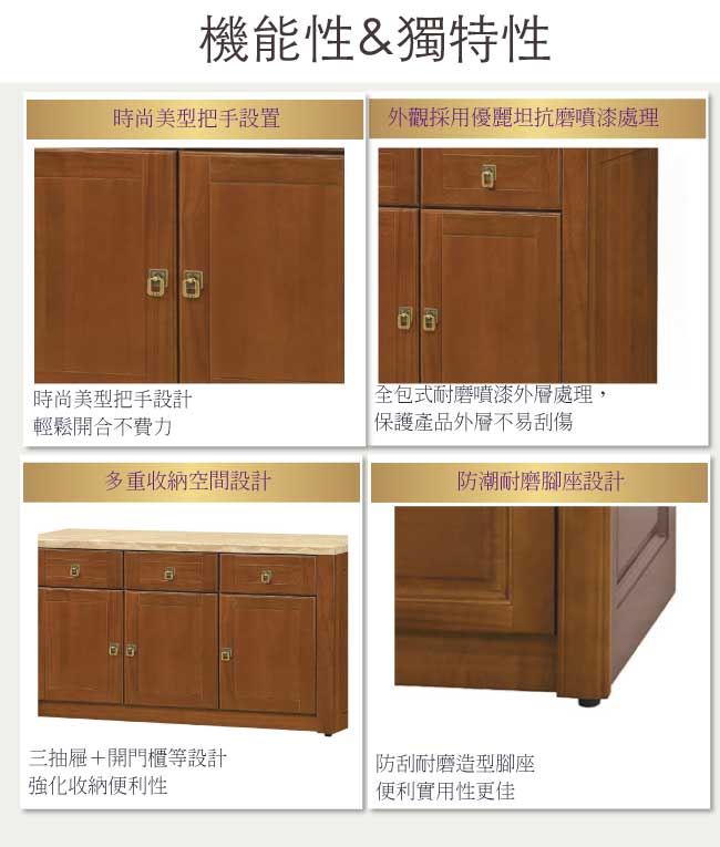商品介紹 | 【綠家居】布塞爾 樟木紋4尺雲紋石面實木餐櫃 樟木紋色系+現代簡約風格+安心材質製造,整體採用樟木實木+松木實木+防蛀木心板+防潮耐磨腳座+五金滑軌結構+2cm雲紋石面板+防夾手緩衝門片五金等安心材質製造,產品外層採用防潮耐磨噴漆處理搭配採用開門櫃+三抽屜+內開放式收納等收納空間設計,全由專人配送到家,專業安心服務,替你省下更多時間! 【商品特色】 樟木紋色系+現代簡約風格+安心材質製造,使用放心+搭配居家更便利 採用樟木實木+松木實木+防蛀木心板+防潮耐磨腳座+五金滑軌結構+2cm雲紋石面板+防夾手緩衝門片五金等安心材質製造 產品外層採用防潮耐磨噴漆處理 搭配採用開門櫃+三抽屜+內開放式收納等收納空間設計 此商品不需要DIY組立,此商品為組立後之成品 品質保證、專業設計、貼心服務 全由專人配送到家,專業安心服務,替您省下更多時間 |