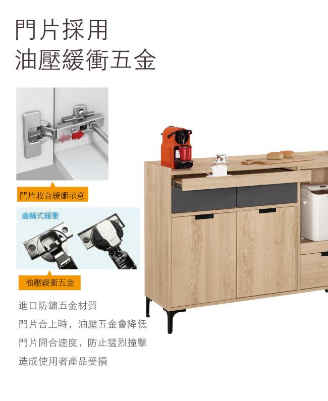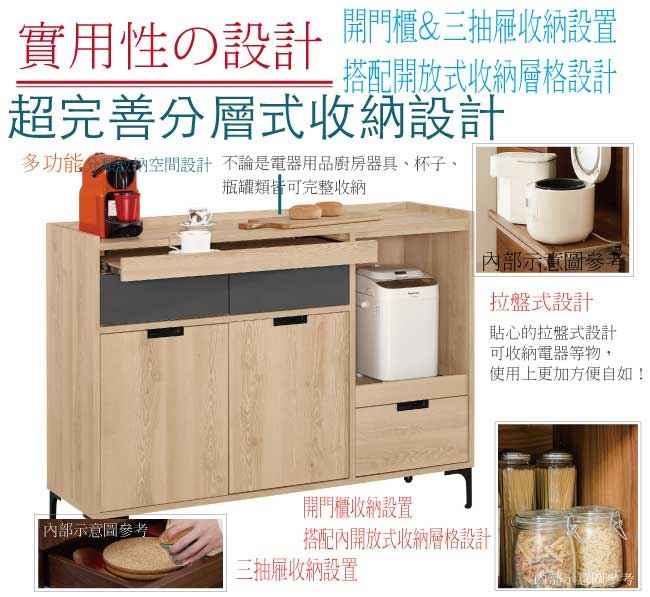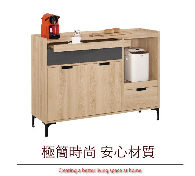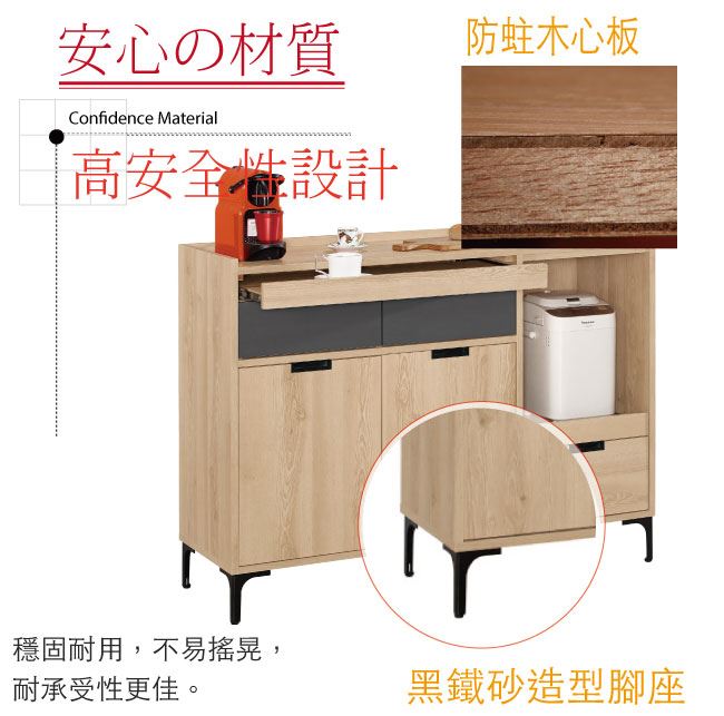 商品介紹 | 【綠家居】卡泰 雙色4尺二門三抽餐櫃 橡木紋雙色系+現代簡約風格+安心材質製造,整體採用防蛀木心板+五金滑軌結構+黑鐵砂腳座+防夾手緩衝門片五金等安心材質製造,外層採用優利坦全包式耐磨噴漆處理搭配開門櫃+三抽屜+拉合式層架+內&外開放式層格等收納設計,全由專人配送到家,專業安心服務,替你省下更多時間! 【商品特色】 橡木紋雙色系+現代簡約風格+安心材質製造,使用放心+搭配居家更便利 採用防蛀木心板+五金滑軌結構+黑鐵砂腳座+防夾手緩衝門片五金等安心材質製造 開門櫃+三抽屜+拉合式層架+內&外開放式層格等收納設計 此商品不需要DIY組立,此商品為組立後之成品 品質保證、專業設計、貼心服務 全由專人配送到家,專業安心服務,替您省下更多時間 |