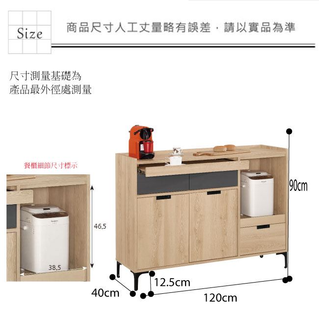 材質 | ◆產品名稱: 【綠家居】卡泰 雙色4尺二門三抽餐櫃 產品尺寸: 尺寸:(寬)120x(深)40x(高)90公分 ◆材質: 材質:防蛀木心板+黑鐵砂腳座 材質:五金滑軌結構+防夾手緩衝門片五金 塗漆:優利坦全包式耐磨噴漆處理