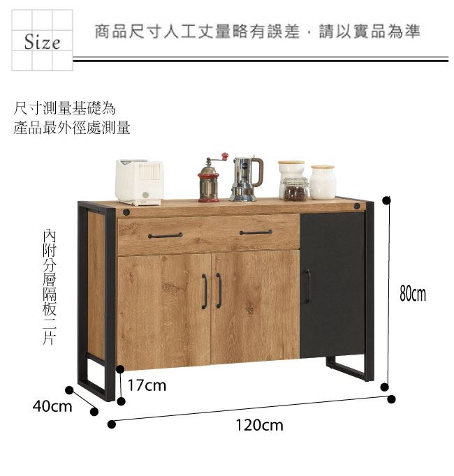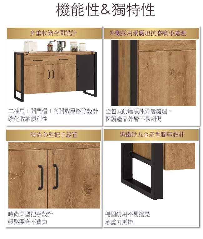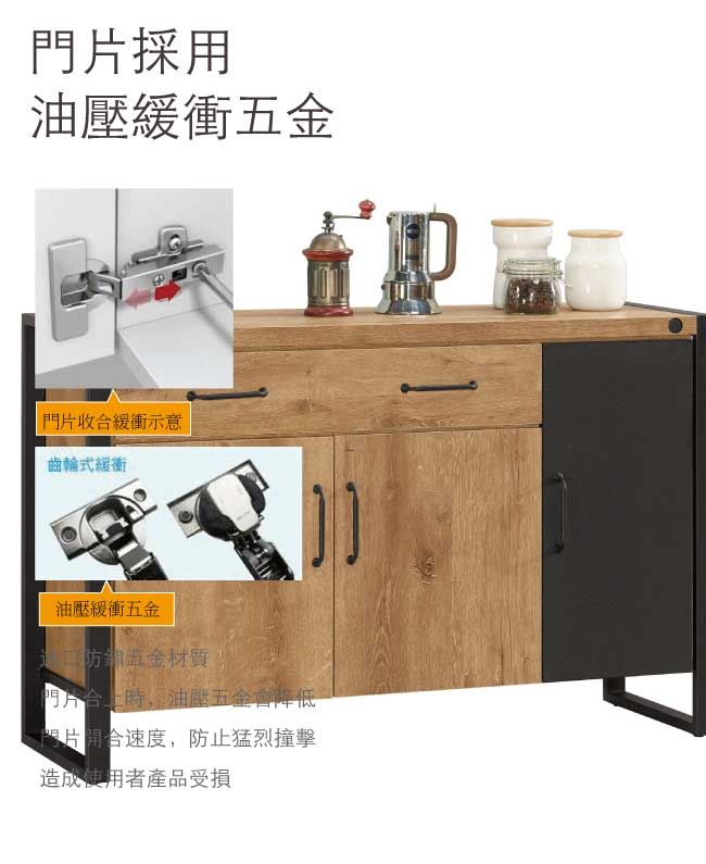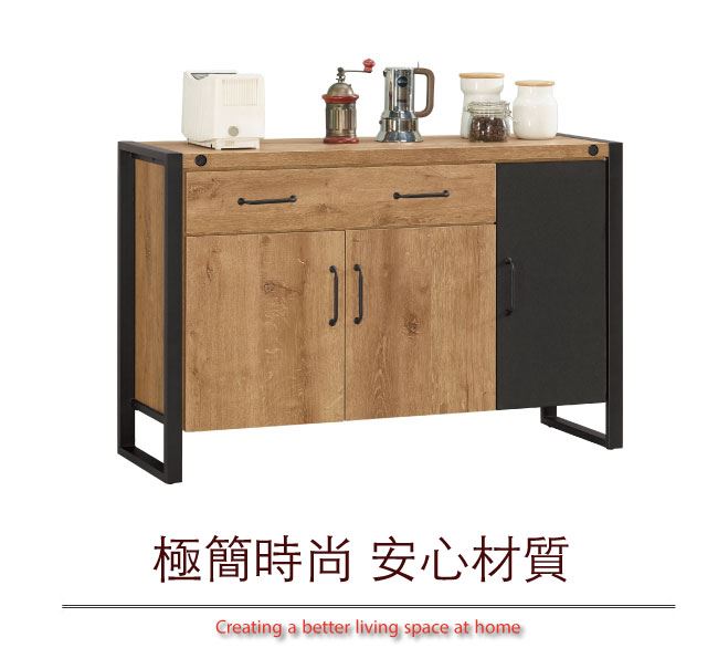 材質 | ◆產品名稱: 【綠家居】馬柏 雙色4尺三門單抽餐櫃/收納櫃 產品尺寸: 尺寸:(寬)120x(深)40x(高)80公分 ◆材質: 材質:防蛀木心板+黑鐵砂邊框&腳座 材質:五金滑軌結構+防夾手緩衝門片五金 塗漆:優利坦全包式耐磨噴漆處理