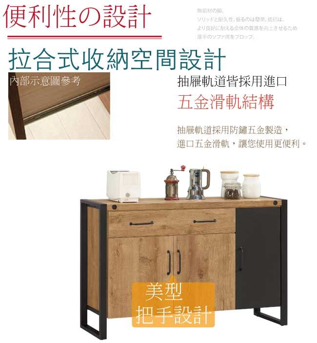 商品介紹 | 【綠家居】馬柏 雙色4尺三門單抽餐櫃/收納櫃 木紋雙色系+現代簡約風格+安心材質製造,整體採用防蛀木心板+五金滑軌結構+黑鐵砂邊框&腳座+防夾手緩衝門片五金等安心材質製造,外層採用優利坦全包式耐磨噴漆處理搭配開門櫃+單抽屜+內開放式層格等收納設計,全由專人配送到家,專業安心服務,替你省下更多時間! 【商品特色】 木紋雙色系+現代簡約風格+安心材質製造,使用放心+搭配居家更便利 採用防蛀木心板+五金滑軌結構+黑鐵砂邊框&腳座+防夾手緩衝門片五金等安心材質製造 開門櫃+單抽屜+內開放式層格等收納設計 此商品不需要DIY組立,此商品為組立後之成品 品質保證、專業設計、貼心服務 全由專人配送到家,專業安心服務,替您省下更多時間 |