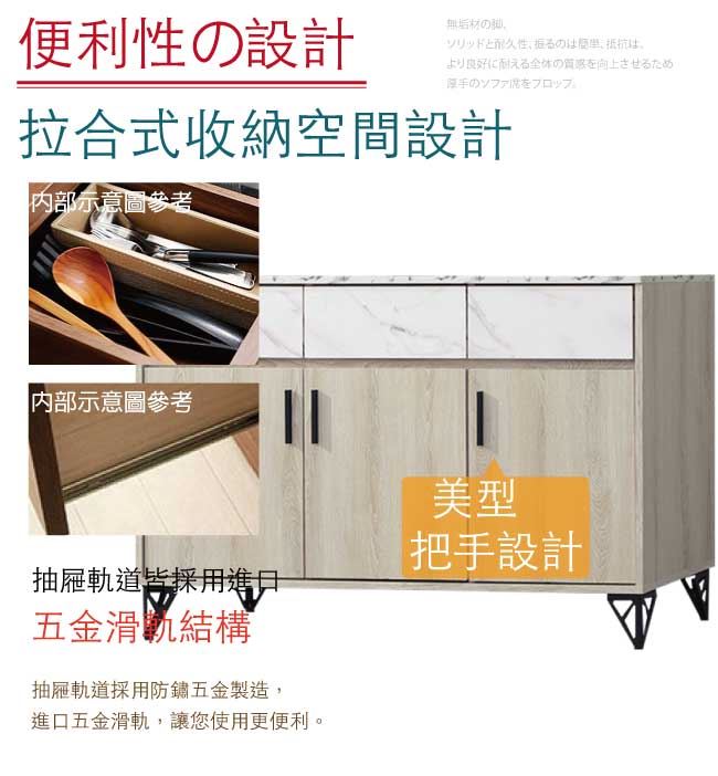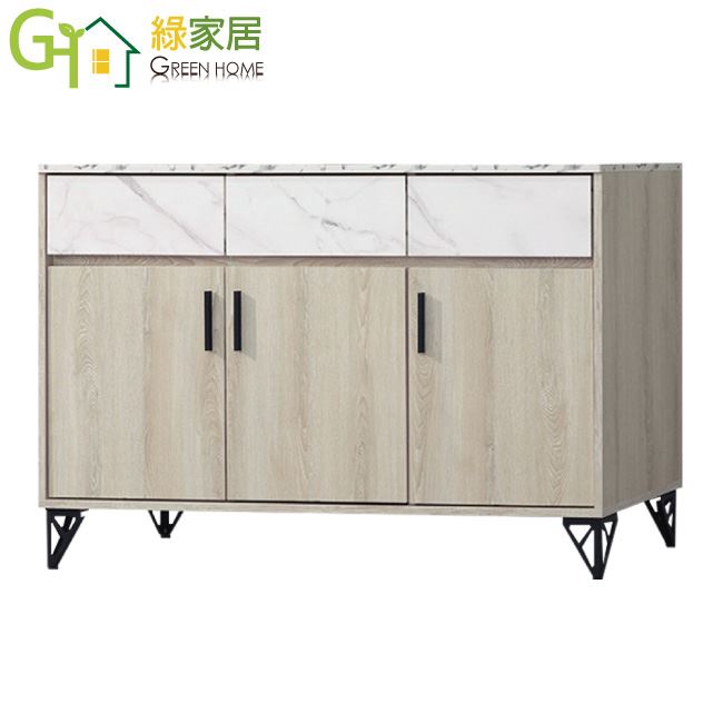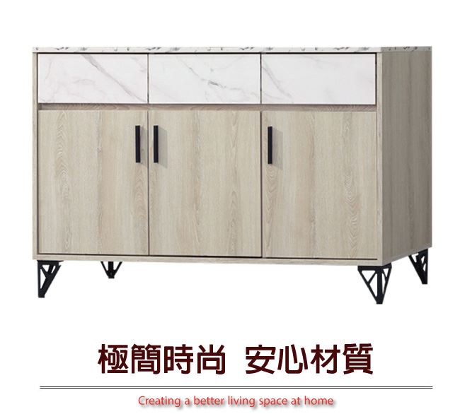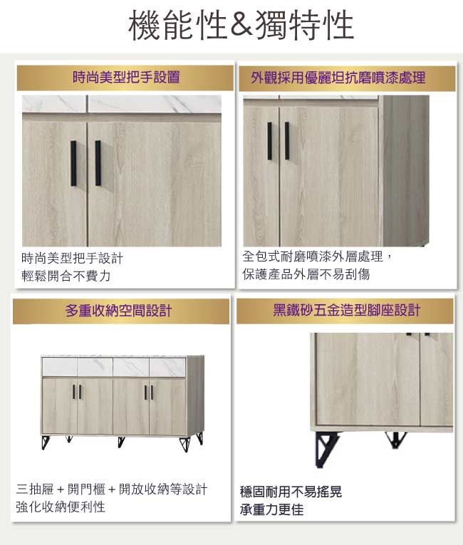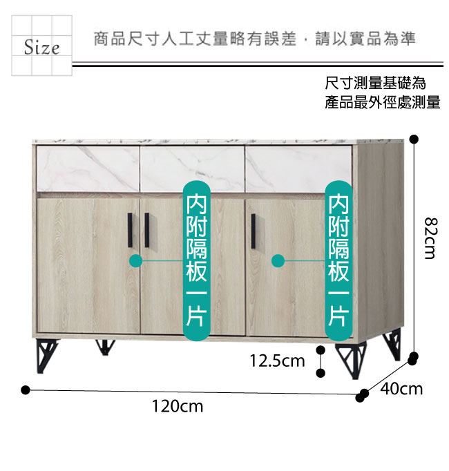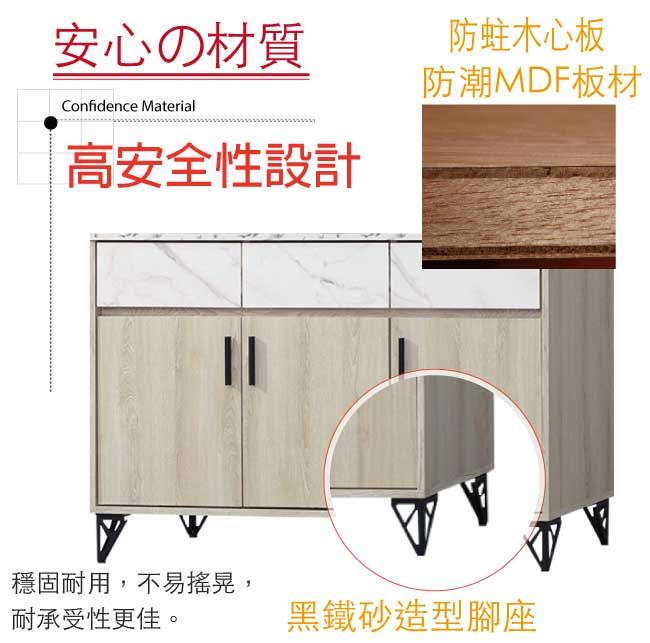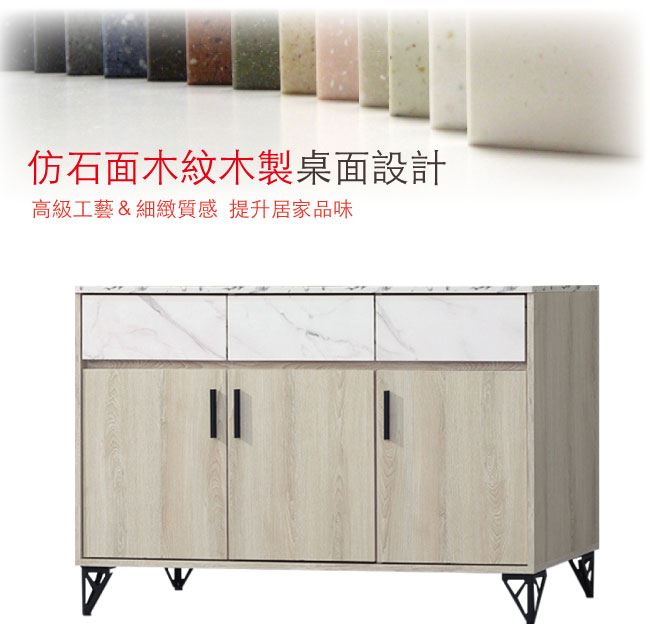 材質 | ◆產品名稱: 【綠家居】艾安德 雙色4尺三門三抽餐櫃 尺寸:(寬)120x(深)40x(高)82/公分 ◆材質: 材質:防蛀木心板+黑鐵砂腳座+五金滑軌結構+仿雲紋石面紋路木質面板 噴漆:防潮耐磨噴漆處理