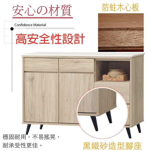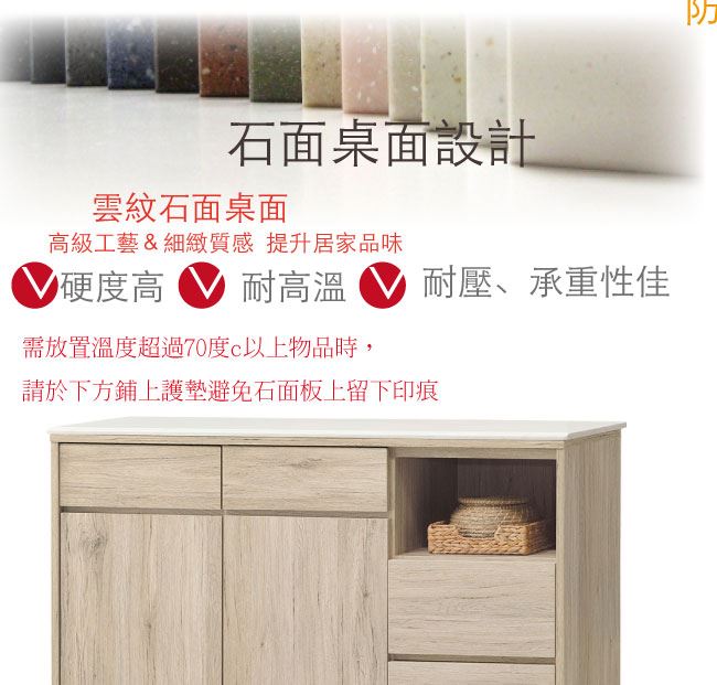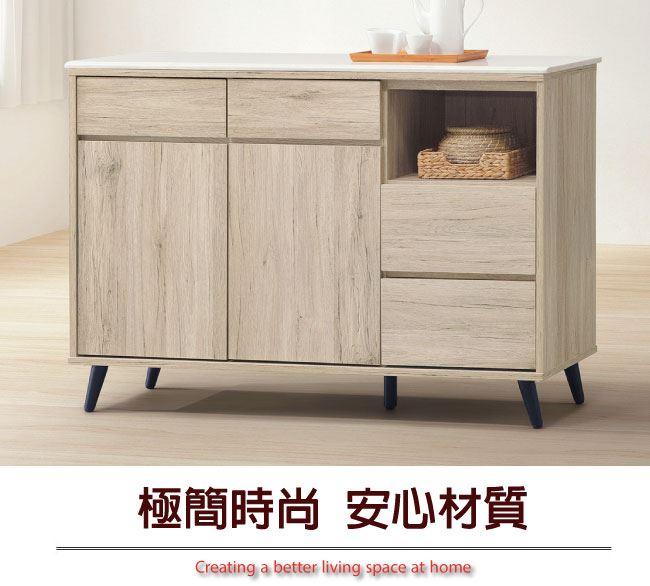 商品介紹 | 【綠家居】艾歐柏 時尚4尺雲紋石面餐櫃 橡木紋色系+現代簡約風格+安心材質製造,整體採用防蛀木心板+黑鐵砂腳座+五金滑軌結構+12mm雲紋石面板+防夾手緩衝門片五金等安心材質製造,產品外層採用防潮耐磨噴漆處理搭配開門櫃+四抽屜+開放式層格等收納空間設計,全由專人配送到家,專業安心服務,替你省下更多時間! 【商品特色】 橡木紋色系+現代簡約風格+安心材質製造,使用放心+搭配居家更便利 採用防蛀木心板+黑鐵砂腳座+五金滑軌結構+12mm雲紋石面板+防夾手緩衝門片五金等安心材質製造 產品外層採用防潮耐磨噴漆處理 搭配開門櫃+四抽屜+開放式層格等收納空間設計 此商品不需要DIY組立,此商品為組立後之成品 品質保證、專業設計、貼心服務 全由專人配送到家,專業安心服務,替您省下更多時間 |