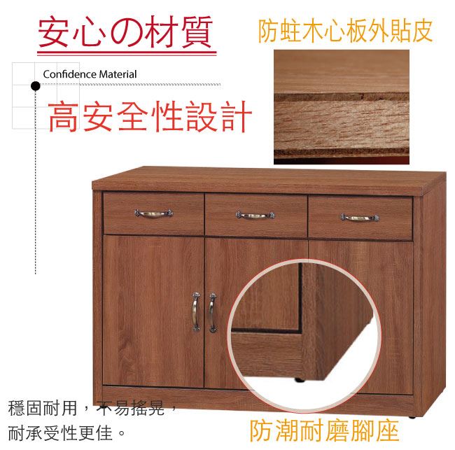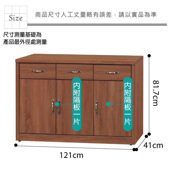 材質 | ◆產品名稱: 【綠家居】卡德 時尚4尺三門三抽餐櫃/收納櫃 尺寸:(寬)121x(深)41x(高)81.7公分 ◆材質: 材質:防蛀木心板+防潮耐磨腳座+五金滑軌結構 外層採用全包式防潮耐磨噴漆處理