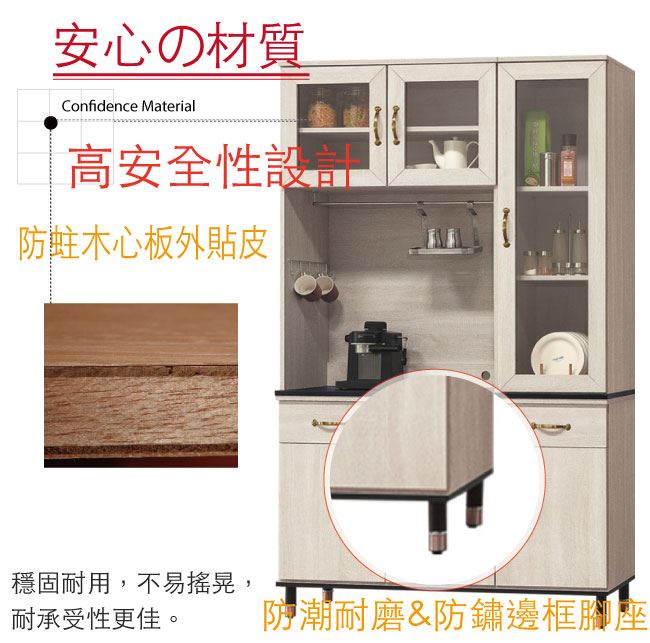 材質 | ◆產品名稱: 【綠家居】瓦利德 時尚4尺雲紋石面餐櫃/收納櫃組合 尺寸:(寬)121x(深)41x(高)201.5公分 ◆材質: 材質:防蛀木心板+防潮耐磨&防鏽邊框腳座+五金滑軌結構+12mm雲紋石面板 外層採用全包式防潮耐磨噴漆處理