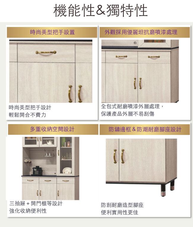 商品 介紹 | 【綠家居】瓦利德 時尚4尺雲紋石面餐櫃/收納櫃組合 淺橡木紋色系+現代簡約風格+安心材質製造,整體採用防蛀木心板+防潮耐磨&防鏽邊框腳座+五金滑軌結構+12mm雲紋石面板等安心材質製造,外層採用全包式防潮耐磨噴漆處理搭配採用開門櫃+三抽屜+開放式收納層格等收納空間設計,全由專人配送到家,專業安心服務,替你省下更多時間! 【商品特色】 淺橡木紋色系+現代簡約風格+安心材質製造,使用放心+搭配居家更便利 採用防蛀木心板+防潮耐磨&防鏽邊框腳座+五金滑軌結構+12mm雲紋石面板等安心材質製造 採用開門櫃+三抽屜+開放式收納層格等收納空間設計 此商品不需要DIY組立,此商品為組立後之成品 品質保證、專業設計、貼心服務 全由專人配送到家,專業安心服務,替您省下更多時間 |