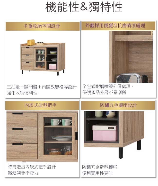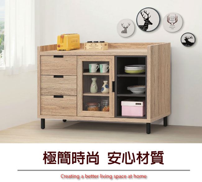 商品 介紹 | 【綠家居】羅特希 橡木紋4尺單門三抽餐櫃 橡木紋色系+現代簡約風格+安心材質製造,整體採用防蛀木心板+五金滑軌結構+黑鐵砂腳座+防夾手緩衝門片五金等安心材質製造,外層採用優利坦全包式耐磨噴漆處理搭配開門櫃+三抽屜+開放式層格等收納設計,全由專人配送到家,專業安心服務,替你省下更多時間! 【商品特色】 橡木紋色系+現代簡約風格+安心材質製造,使用放心+搭配居家更便利 採用防蛀木心板+五金滑軌結構+黑鐵砂腳座+防夾手緩衝門片五金等安心材質製造 開門櫃+三抽屜+開放式層格等收納設計 品質保證、專業設計、貼心服務 全由專人配送到家,專業安心服務,替您省下更多時間 |