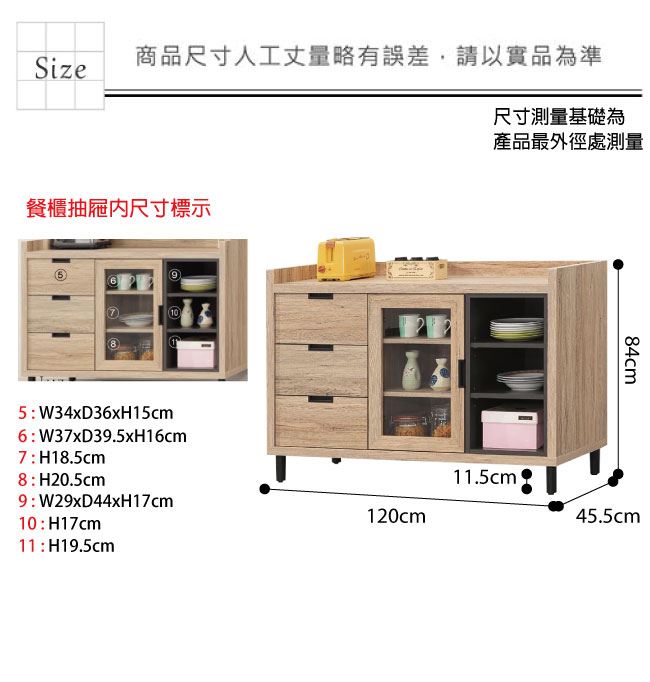 材質 | ◆產品名稱: 【綠家居】羅特希 橡木紋4尺單門三抽餐櫃 產品尺寸: 尺寸:(寬)120x(深)45.5x(高)84公分 ◆材質: 材質:防蛀木心板+黑鐵砂腳座 材質:五金滑軌結構+防夾手緩衝門片五金 塗漆:優利坦全包式耐磨噴漆處理