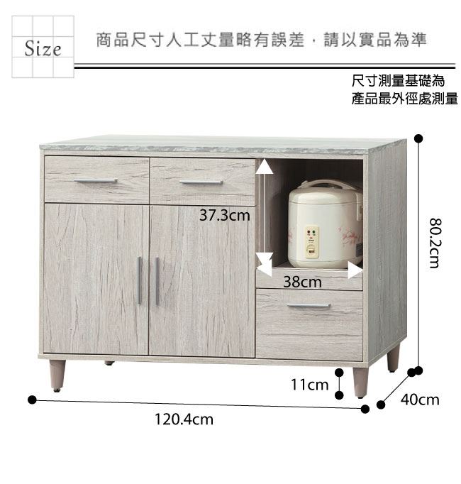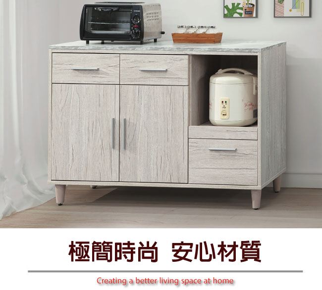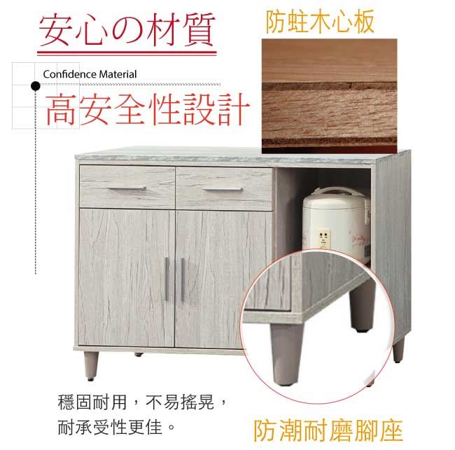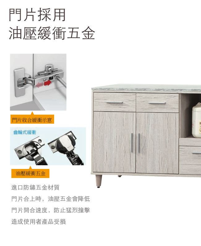 材質 | ◆產品名稱: 【綠家居】瑪波特 橡木紋4尺二門三抽餐櫃 產品尺寸: 尺寸:(寬)120.4x(深)40x(高)80.2/公分 ◆材質: 材質:防蛀木心板+防潮耐磨腳座 材質:五金滑軌結構+仿雲紋石紋路木質桌面板+防夾手緩衝門片五金 塗漆:優利坦全包式耐磨噴漆處理