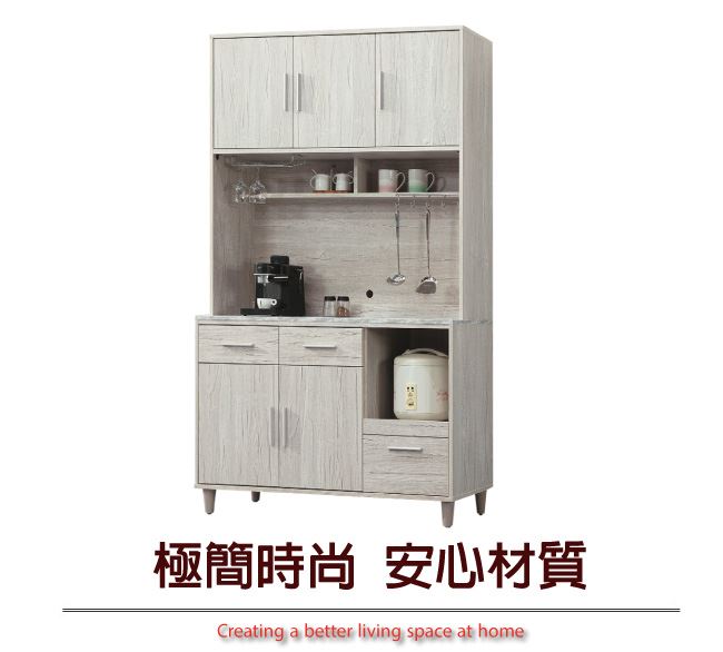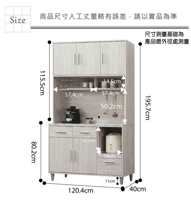 材質 | ◆產品名稱: 【綠家居】瑪波特 橡木紋4尺五門三抽高餐櫃組合 產品尺寸: 尺寸:(寬)120.4x(深)40x(高)195.7/公分 ◆材質: 材質:防蛀木心板+防潮耐磨腳座 材質:五金滑軌結構+仿雲紋石紋路木質桌面板+防夾手緩衝門片五金 塗漆:優利坦全包式耐磨噴漆處理
