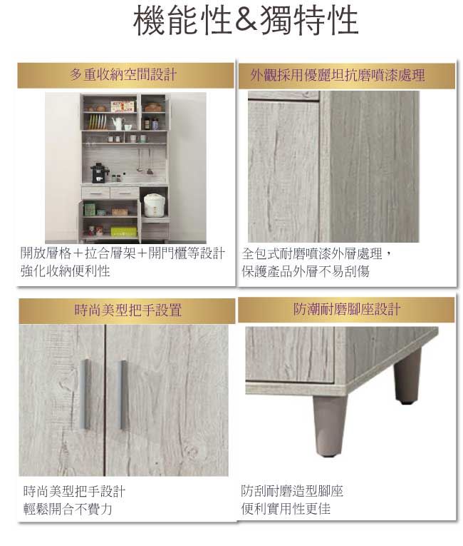 商品 介紹 | 【綠家居】瑪波特 橡木紋4尺五門三抽高餐櫃組合 淺橡木紋色系+現代簡約風格+安心材質製造,整體採用防蛀木心板+五金滑軌結構+防潮耐磨腳座+仿雲紋石紋路木質桌面板+防夾手緩衝門片五金等安心材質製造,外層採用優利坦全包式耐磨噴漆處理搭配開門櫃+三抽屜+開放式層格+拉合式層架等收納設計,全由專人配送到家,專業安心服務,替你省下更多時間! 【商品特色】 淺橡木紋色系+現代簡約風格+安心材質製造,使用放心+搭配居家更便利 採用防蛀木心板+五金滑軌結構+防潮耐磨腳座+仿雲紋石紋路木質桌面板+防夾手緩衝門片五金等安心材質製造 開門櫃+三抽屜+開放式層格+拉合式層架等收納設計 品質保證、專業設計、貼心服務 全由專人配送到家,專業安心服務,替您省下更多時間 |