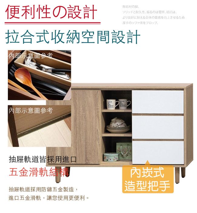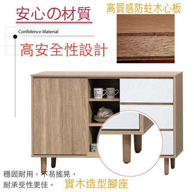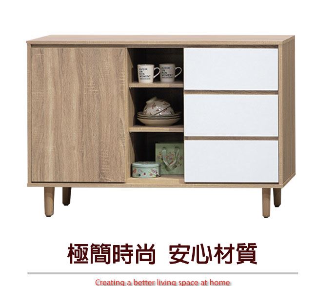 商品 介紹 | 【綠家居】凱魯蒂 現代4尺單門三抽餐櫃/收納櫃 木紋雙色系+現代簡約風格+安心材質製造,整體採用防蛀木心板+五金滑軌結構+防潮實木腳座+防夾手緩衝門片五金等安心材質製造,外層採用優利坦全包式耐磨噴漆處理搭配採用開門櫃+內開放式收納+三抽屜等便利設計,全由專人配送到家,專業安心服務,替你省下更多時間! 【商品特色】 木紋雙色系+現代簡約風格+安心材質製造,使用放心+搭配居家更便利 採用防蛀木心板+五金滑軌結構+防潮實木腳座+防夾手緩衝門片五金等安心材質製造 採用開門櫃+內開放式收納+三抽屜等便利設計 此商品不需要DIY組立,此商品為組立後之成品 品質保證、專業設計、貼心服務 全由專人配送到家,專業安心服務,替您省下更多時間 |