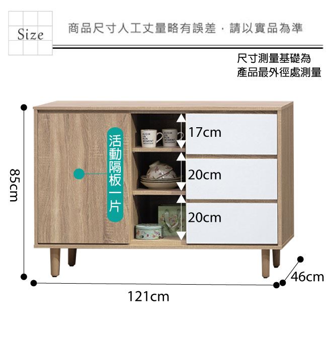 材質 | ◆產品名稱: 【綠家居】凱魯蒂 現代4尺單門三抽餐櫃/收納櫃 產品尺寸: 尺寸:(寬)121(深)46x(高)85/公分 ◆材質: 材質:防蛀木心板+五金滑軌結構+防潮實木腳座+防夾手緩衝門片五金 塗漆:優利坦全包式耐磨噴漆處理