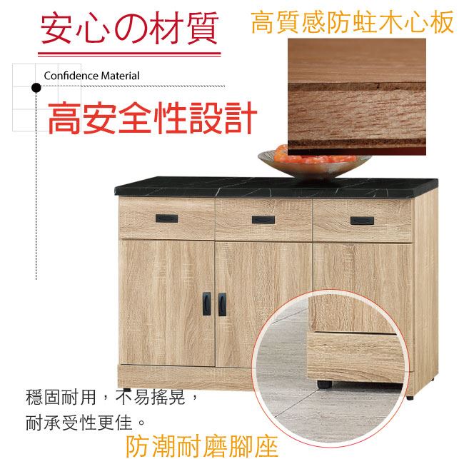材質 | ◆產品名稱: 【綠家居】戴納 現代4尺雲紋石面餐櫃/收納櫃 產品尺寸: 尺寸:(寬)121(深)43x(高)89.2/公分 ◆材質: 材質:防蛀木心板+五金滑軌結構+防潮耐磨腳座+防夾手緩衝門片五金+12mm雲紋石面板 塗漆:優利坦全包式耐磨噴漆處理