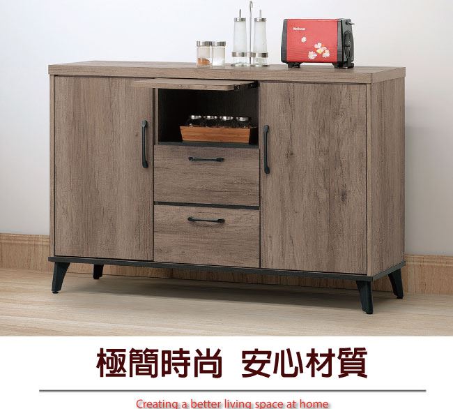 商品 介紹 | 【綠家居】艾歐洛 現代4尺二門二抽餐櫃/收納櫃 橡木紋色系+現代簡約風格+安心材質製造,整體採用防蛀木心板+五金滑軌結構+防潮黑漆腳座+防夾手緩衝門片五金等安心材質製造,外層採用優利坦全包式耐磨噴漆處理搭配採用開門櫃+開放式收納+二抽屜+拉合式層架等便利設計,全由專人配送到家,專業安心服務,替你省下更多時間! 【商品特色】 橡木紋色系+現代簡約風格+安心材質製造,使用放心+搭配居家更便利 採用防蛀木心板+五金滑軌結構+防潮黑漆腳座+防夾手緩衝門片五金等安心材質製造 採用開門櫃+開放式收納+二抽屜+拉合式層架等便利設計 此商品不需要DIY組立,此商品為組立後之成品 品質保證、專業設計、貼心服務 全由專人配送到家,專業安心服務,替您省下更多時間 |