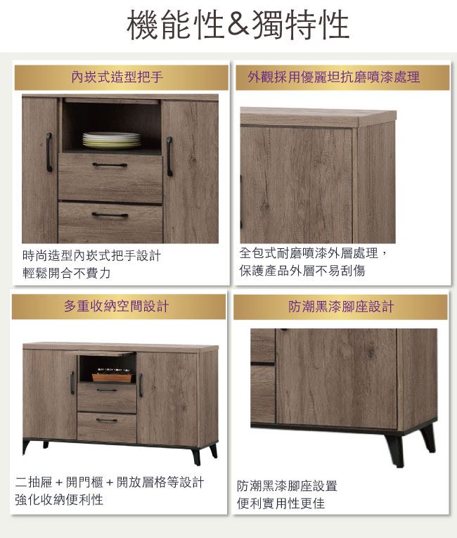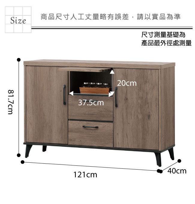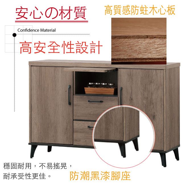 材質 | ◆產品名稱: 【綠家居】艾歐洛 現代4尺二門二抽餐櫃/收納櫃 尺寸:(寬)121(深)40x(高)81.7/公分 ◆材質: 材質:防蛀木心板+五金滑軌結構+防潮黑漆腳座+防夾手緩衝門片五金 塗漆:優利坦全包式耐磨噴漆處理