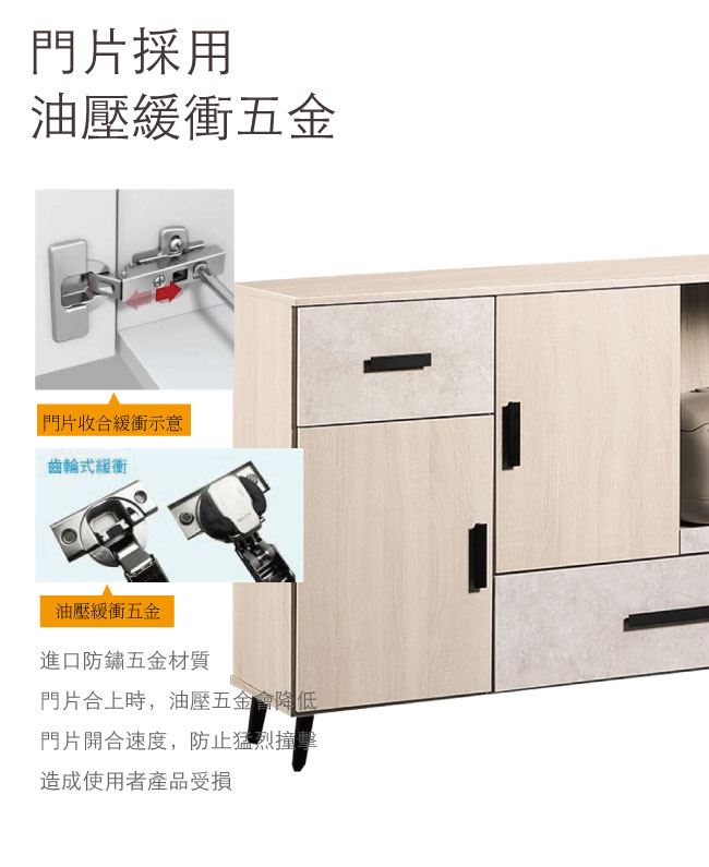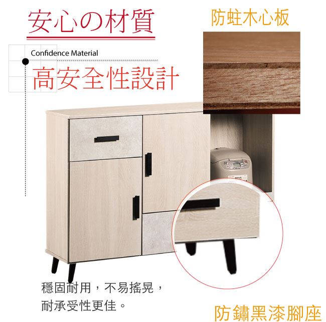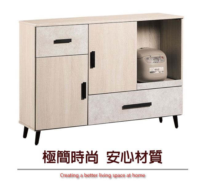 材質 | ◆產品名稱: 【綠家居】西德 淺橡4尺二門二抽餐櫃 產品尺寸: 尺寸:(寬)121x(深)40x(高)88公分 ◆材質: 材質:防蛀木心板+防鏽黑漆腳座 材質:五金滑軌結構+防夾手緩衝門片五金 塗漆:優利坦全包式耐磨噴漆處理