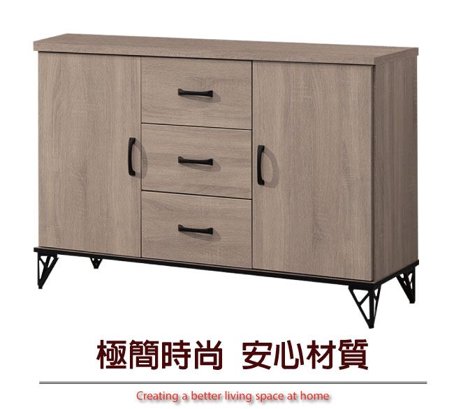 材質 | ◆產品名稱: 【綠家居】菲希 灰橡4.1尺二門三抽餐櫃 產品尺寸: 尺寸:(寬)121.5x(深)40x(高)84公分 ◆材質: 材質:防蛀木心板+防鏽黑漆腳座 材質:五金滑軌結構+防夾手緩衝門片五金 塗漆:優利坦全包式耐磨噴漆處理