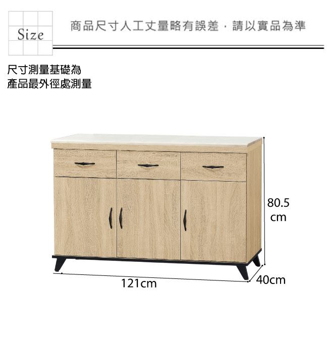 低餐櫃尺寸:(寬)121(深)40(高)82.5公分 ◆材質: 材質:防蛀木心板+黑鐵砂腳座+防夾手緩衝門片五金+五金滑軌結構+12mm雲紋石面桌面板 噴漆:防潮耐磨噴漆處理