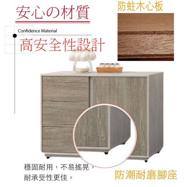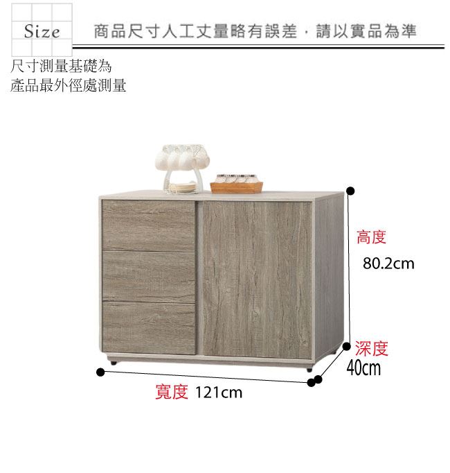 材質 | ◆產品名稱:【綠家居】夏丹雙色4尺單門三抽餐櫃 尺寸:(寬)121x(深)40(高)80.2/公分 ◆材質: 材質:防蛀木心板+防刮耐磨腳座+五金滑軌結構+防夾手緩衝門片五金 噴漆:防潮耐磨噴漆處理