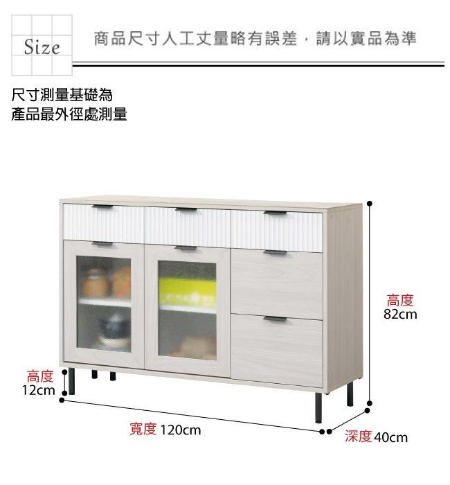 材質 | ◆產品名稱:【綠家居】剛果雙色4尺二門五抽餐櫃/收納櫃 尺寸:(寬)120x(深)40(高)82公分 ◆材質: 材質:防蛀木心板+防鏽黑漆五金腳座(12cm高)+五金滑軌結構 噴漆:防潮亮面&耐磨噴漆處理