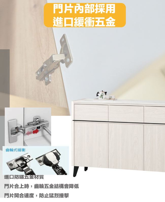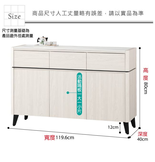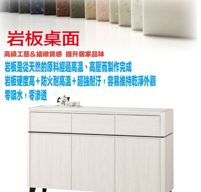 材質 | ◆產品名稱:【綠家居】卡蘿莉岩板4尺三門三抽低餐櫃 餐櫃尺寸:(寬)119.6x(深)40(高)80公分 ◆材質: 材質:防蛀木心板+防鏽五金腳座+防夾手緩衝門片五金+五金滑軌結構+12mm高硬度岩板桌面板 噴漆:防潮耐磨噴漆處理