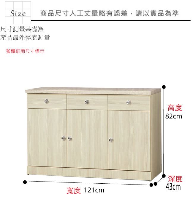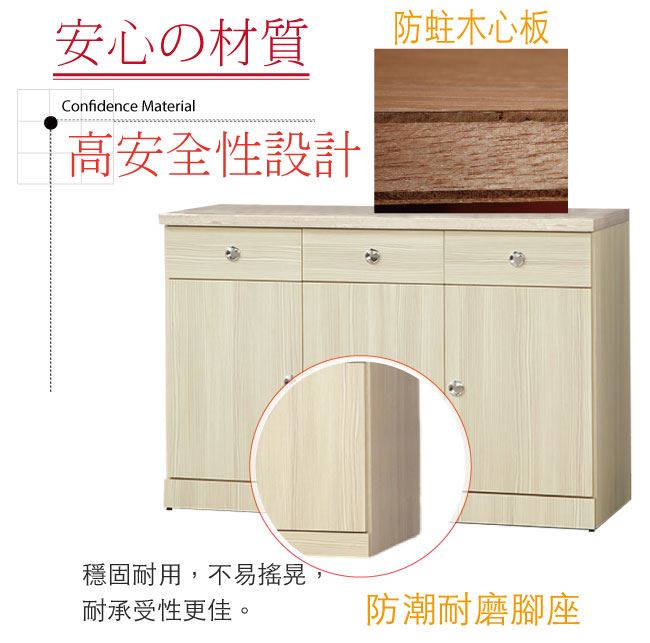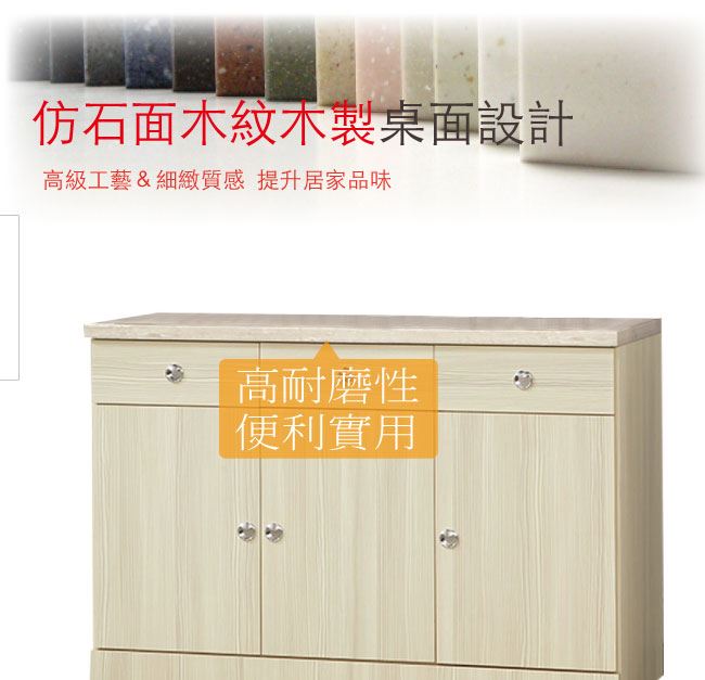 材質 | ◆產品名稱:【綠家居】米瑪4尺三門三抽餐櫃/收納櫃 尺寸:(寬)121x(深)43(高)82/公分 ◆材質: 材質:防蛀木心板+防刮耐磨腳座+五金滑軌結構+仿雲紋石紋木質桌面板 噴漆:防潮耐磨噴漆處理