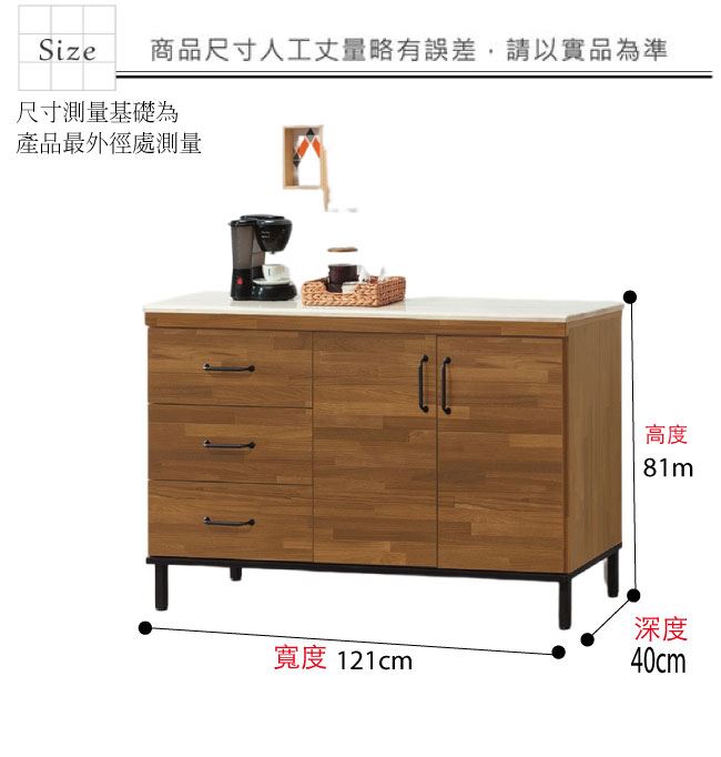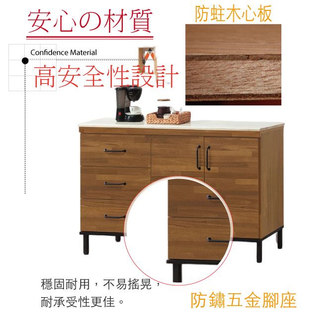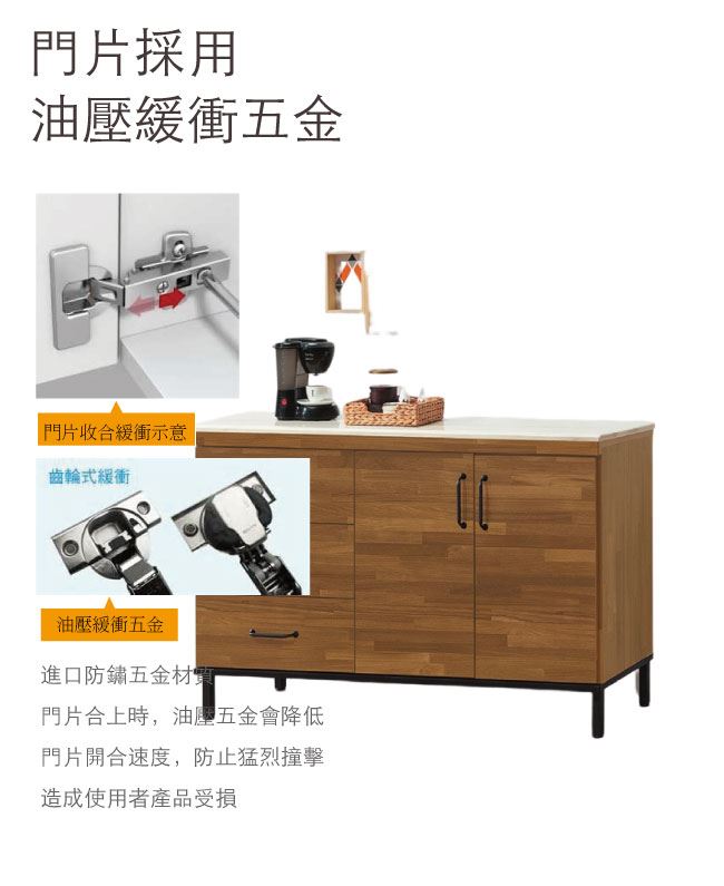 材質 | ◆產品名稱:【綠家居】夏倫岩板4尺二門三抽餐櫃(二色可選) 尺寸:(寬)121x(深)40(高)81/公分 ◆材質: 材質:防蛀木心板+防鏽五金腳座+五金滑軌結構+防夾手緩衝門片五金+12mm高硬度岩板 噴漆:防潮耐磨噴漆處理