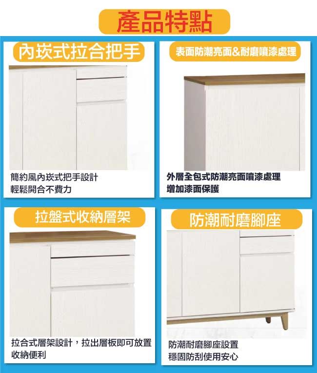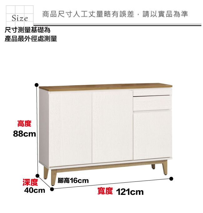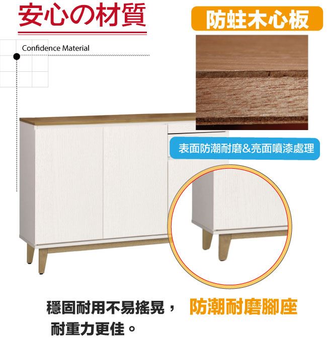 材質 | ◆產品名稱:【綠家居】奈吉亞雙色4尺三門單抽拉盤低餐櫃/收納櫃 尺寸:(寬)121x(深)40(高)88/公分 ◆材質: 材質:防蛀木心板+防潮耐磨腳座(腳座高16cm)+五金滑軌結構 噴漆:防潮耐磨&亮面噴漆處理