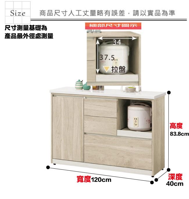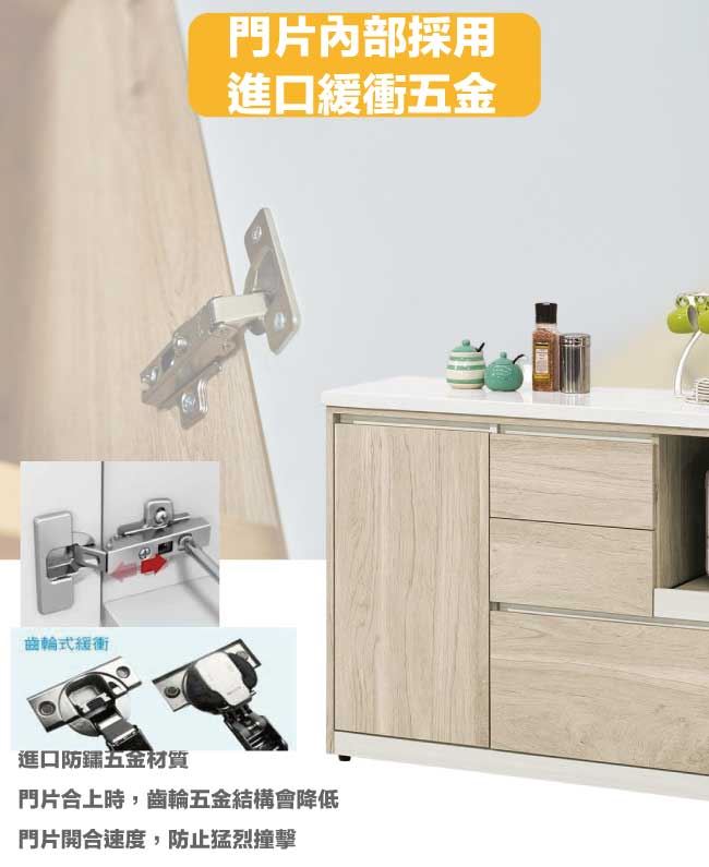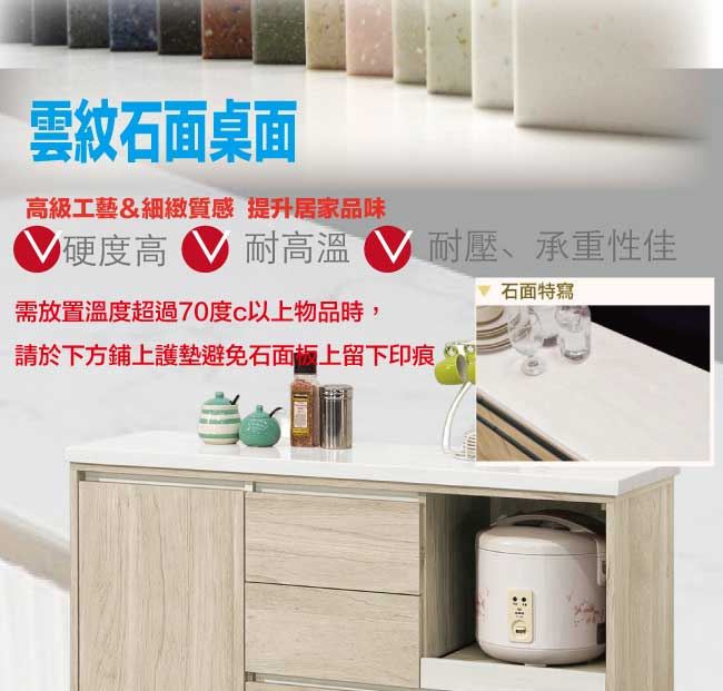 材質 | ◆產品名稱:【綠家居】羅娜4尺雲紋石面拉盤低餐櫃 餐櫃尺寸:(寬)120x(深)40(高)83.8公分 ◆材質: 材質:防蛀木心板+防潮耐磨腳座+防夾手緩衝門片五金+五金滑軌結構+20mm雲紋石面桌面板 噴漆:防潮耐磨噴漆處理