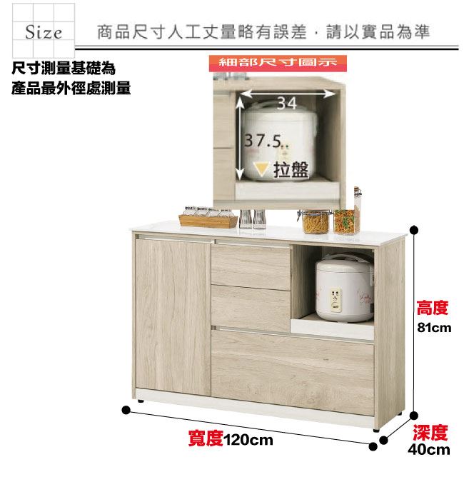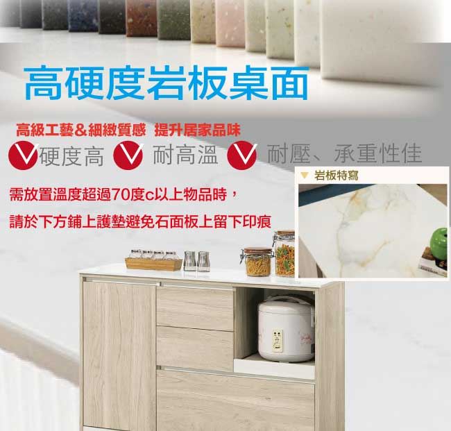 材質 | ◆產品名稱:【綠家居】羅娜岩板4尺單門三抽拉盤低餐櫃 餐櫃尺寸:(寬)120x(深)40(高)81公分 ◆材質: 材質:防蛀木心板+防潮耐磨腳座+防夾手緩衝門片五金+五金滑軌結構+12mm高硬度岩板桌面板 噴漆:防潮耐磨噴漆處理