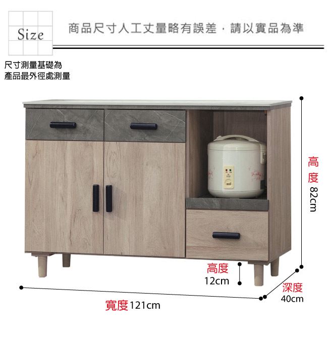 材質 | ◆產品名稱:【綠家居】路卡夫岩板4尺二門三抽餐櫃 尺寸:(寬)121x(深)40(高)82公分 ◆材質: 材質:防蛀木心板+防潮耐磨腳座+五金滑軌結構+防夾手緩衝門片五金+12mm高硬度岩板桌面板 噴漆:防潮耐磨噴漆處理