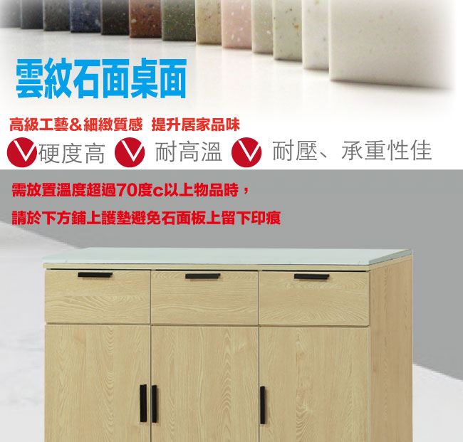 材質 | ◆產品名稱:【綠家居】路思樂4尺雲紋石面餐櫃 餐櫃尺寸:(寬)121x(深)40(高)83.5公分 ◆材質: 材質:防蛀木心板+防潮耐磨腳座+防夾手緩衝門片五金+五金滑軌結構+12mm雲紋石面桌面板 噴漆:防潮耐磨噴漆處理