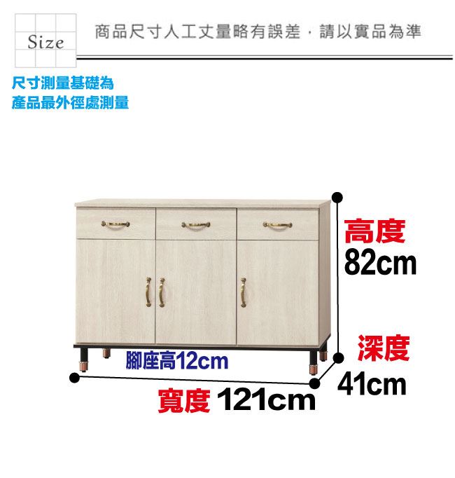 材質 | ◆產品名稱:【綠家居】洛里奇4尺三門三抽低餐櫃 尺寸:(寬)121x(深)41(高)82/公分 ◆材質: 材質:防蛀木心板+烤漆金屬腳座+五金滑軌結構 噴漆:防潮耐磨噴漆處理 |