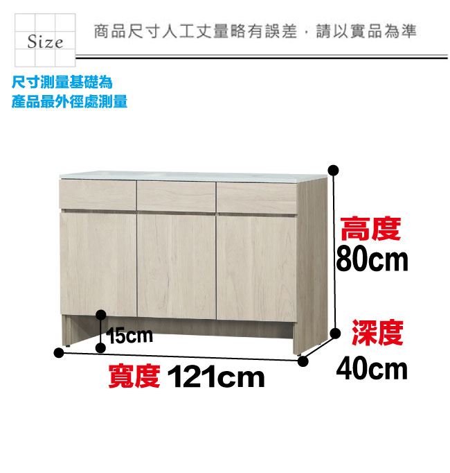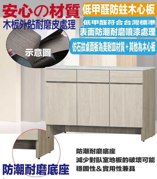 材質 | ◆產品名稱:【綠家居】德維雙色4尺三門三抽低餐櫃 尺寸:(寬)121x(深)40x(高)82/公分 ◆材質: 材質:防蛀木心板+防潮耐磨底座+仿大理石紋耐磨美耐皿面板+五金滑軌結構+防夾手緩衝門片五金 表面防潮耐磨噴漆處理 |