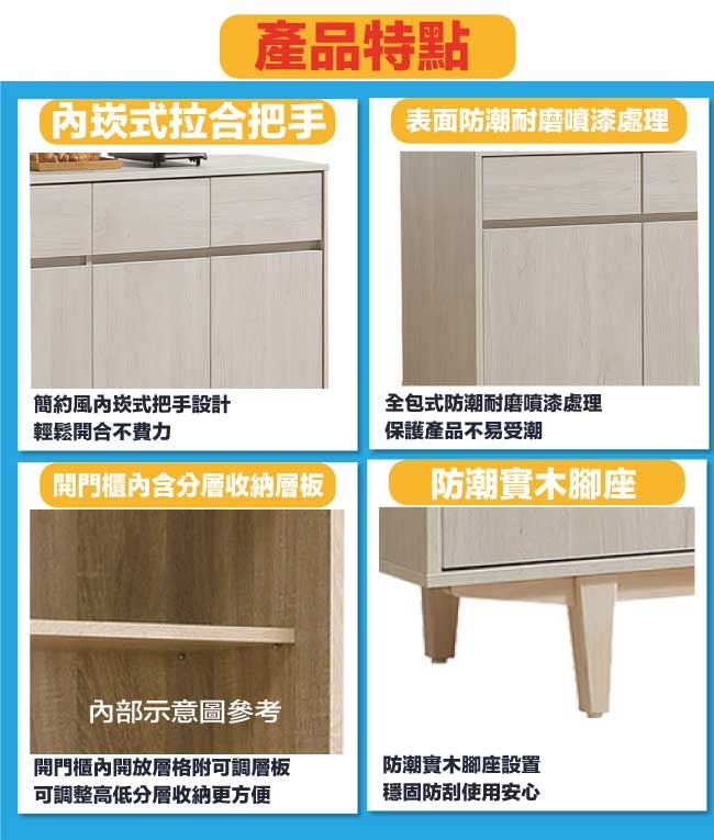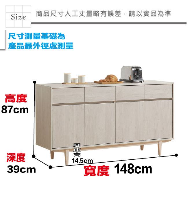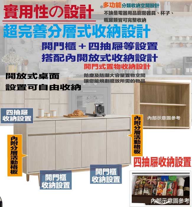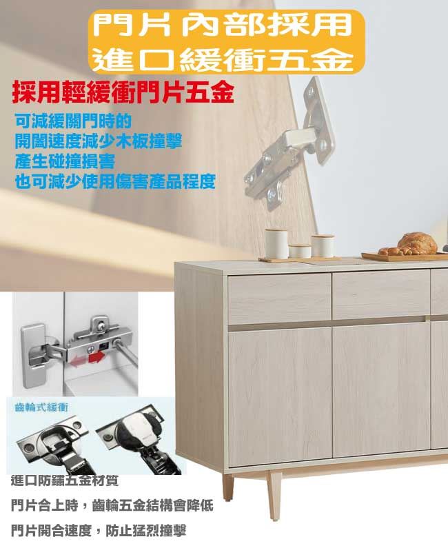商 品 介 紹 | 【綠家居】斯巴雅4.9尺四門四抽低餐櫃/收納櫃 淺橡木紋色系+現代簡約風格+安心材質製造,整體採用防蛀木心板+防潮實木腳座+五金滑軌結構+防夾手緩衝門片五金等安心材質製造,產品外層採用防潮耐磨噴漆處理搭配採用開門櫃+四抽屜+內開放層格等收納空間設計,全由專人配送到家,專業安心服務,替你省下更多時間! 【商品特色】 淺橡木紋色系+現代簡約風格+安心材質製造,使用放心+搭配居家更便利 採用防蛀木心板+防潮實木腳座+五金滑軌結構+防夾手緩衝門片五金等安心材質製造 搭配採用開門櫃+四抽屜+內開放層格等收納空間設計 此商品不需要DIY組立,此商品為組立後之成品 品質保證、專業設計、貼心服務 全由專人配送到家,專業安心服務,替您省下更多時間