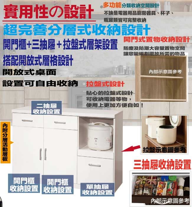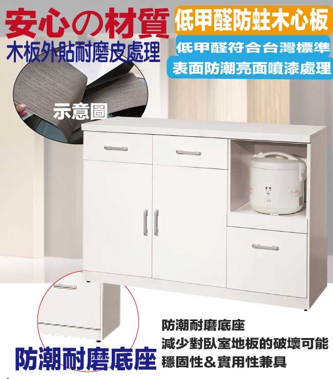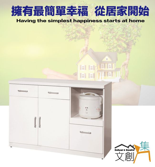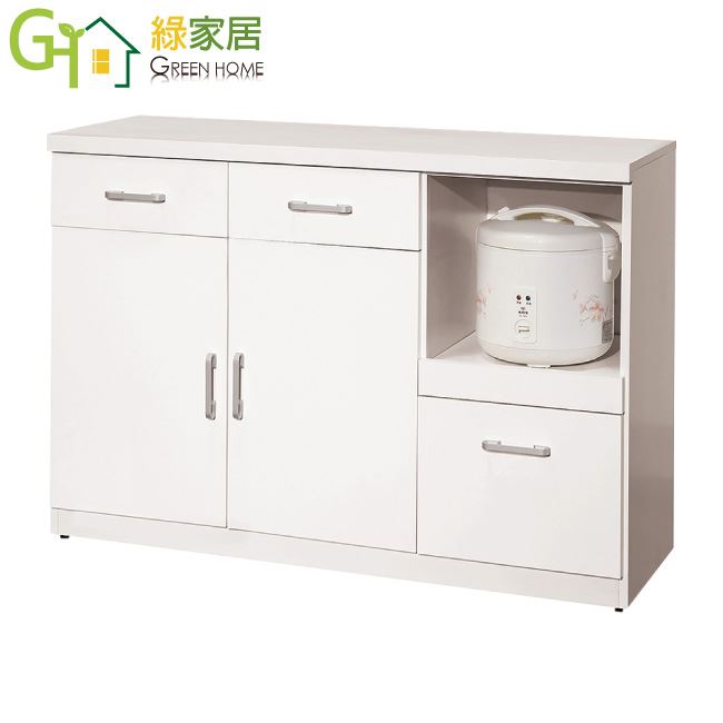 商 品 介 紹 | 【綠家居】巴克雅4尺三抽拉盤低餐櫃/收納櫃 簡約白色系+現代簡約風格+安心材質製造,整體採用防蛀木心板+防潮耐磨腳座+五金滑軌結構等安心材質製造,產品外層表面採用防潮亮面噴漆處理 搭配採用開門櫃+三抽屜+拉合式層盤+內&外開放層格等收納空間設計,全由專人配送到家,專業安心服務,替你省下更多時間! 【商品特色】 簡約白色系+現代簡約風格+安心材質製造,使用放心+搭配居家更便利 採用防蛀木心板+防潮耐磨腳座+五金滑軌結構等安心材質製造 搭配採用開門櫃+三抽屜+拉合式層盤+內&外開放層格等收納空間設計 此商品不需要DIY組立,此商品為組立後之成品 品質保證、專業設計、貼心服務 全由專人配送到家,專業安心服務,替您省下更多時間