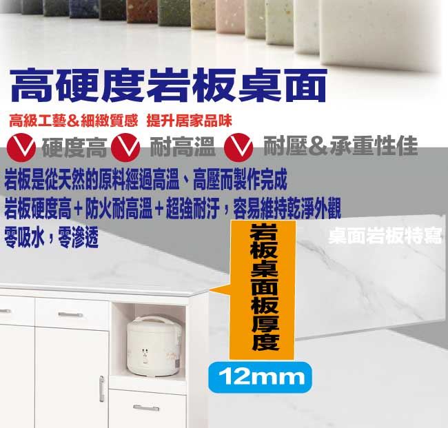 材質 | ◆產品名稱:【綠家居】巴克雅4尺岩板三抽拉盤低餐櫃/收納櫃 尺寸:(寬)121x(深)41(高)85/公分 ◆材質: 材質:防蛀木心板+防潮耐磨腳座+五金滑軌結構+12mm高硬度岩板桌面板 表面防潮亮面噴漆處理 |