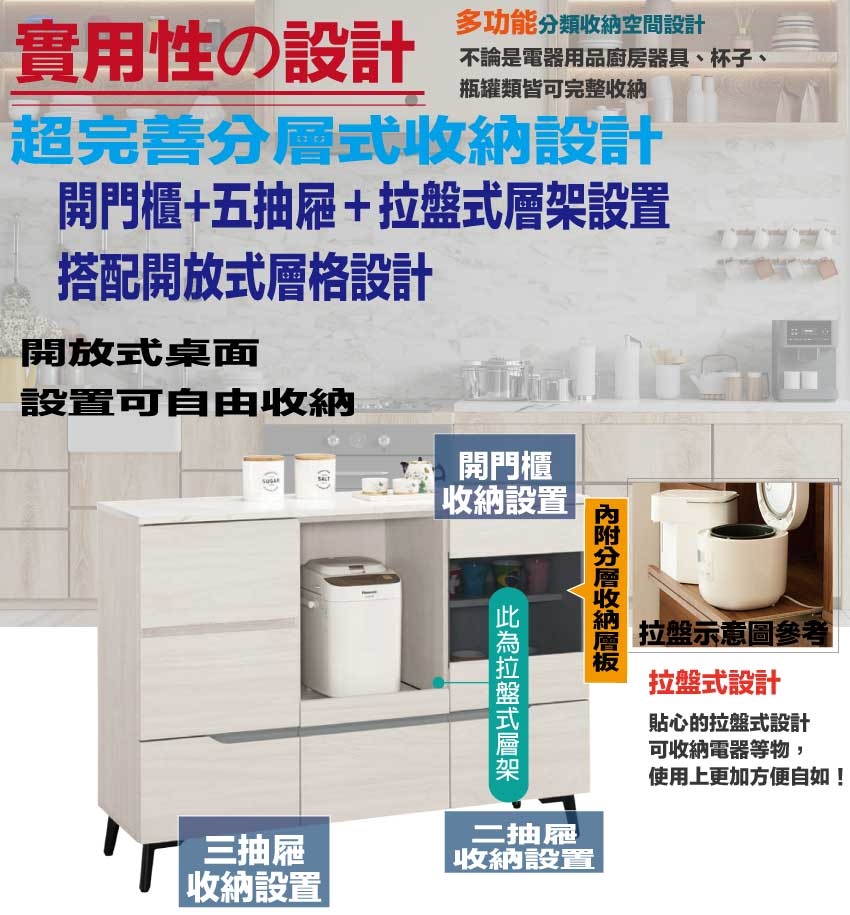 搭配採用開門櫃+拉盤層架+五抽屜+內&外開放層格等收納空間設計
