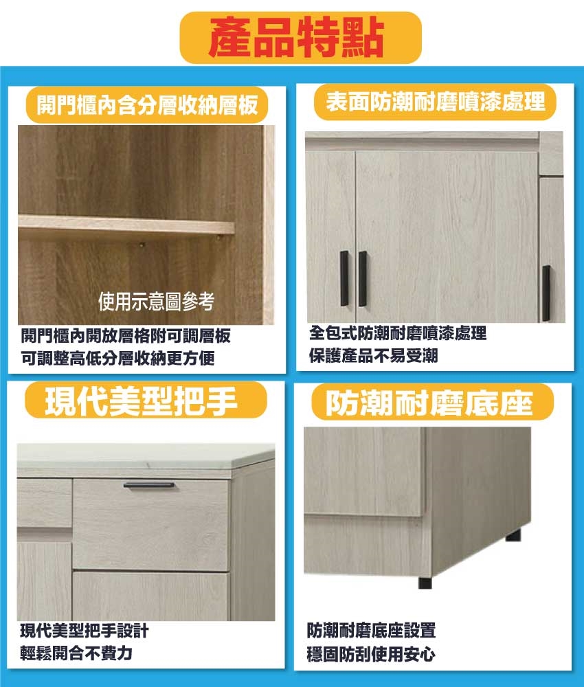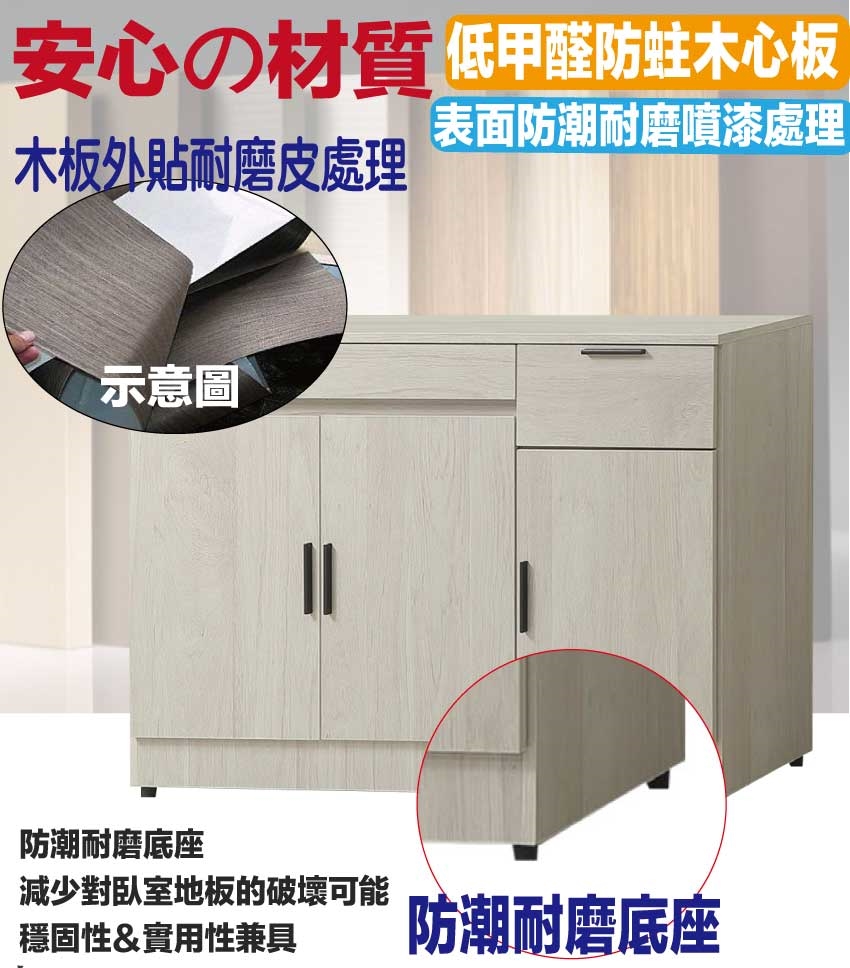 採用防蛀木心板+防夾手緩衝門片五金+防潮耐磨底座+五金滑軌結構等安心材質製造