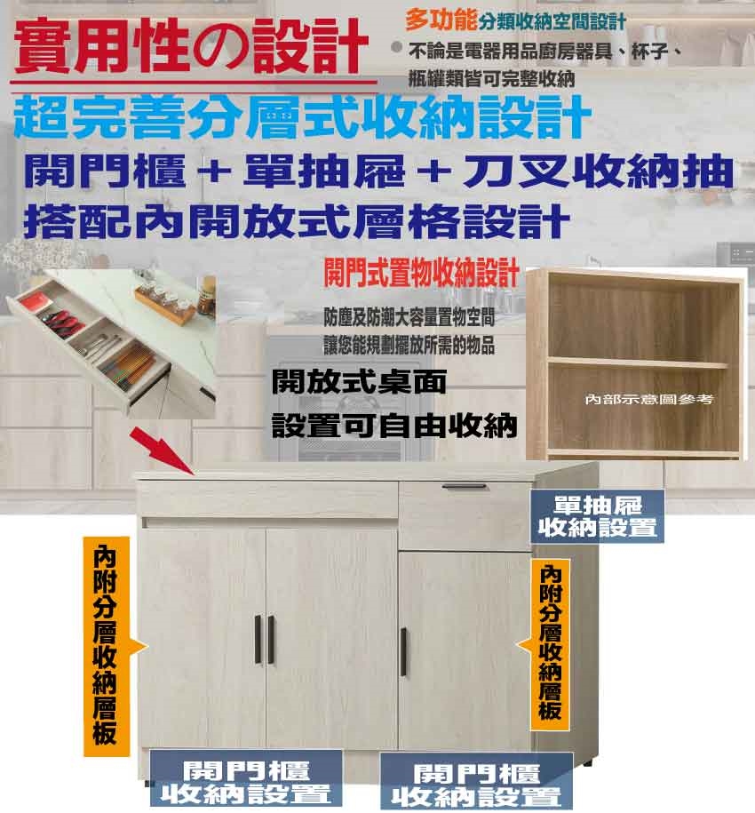 搭配採用開門櫃+二抽屜+內開放層格等收納空間設計