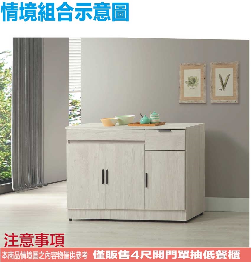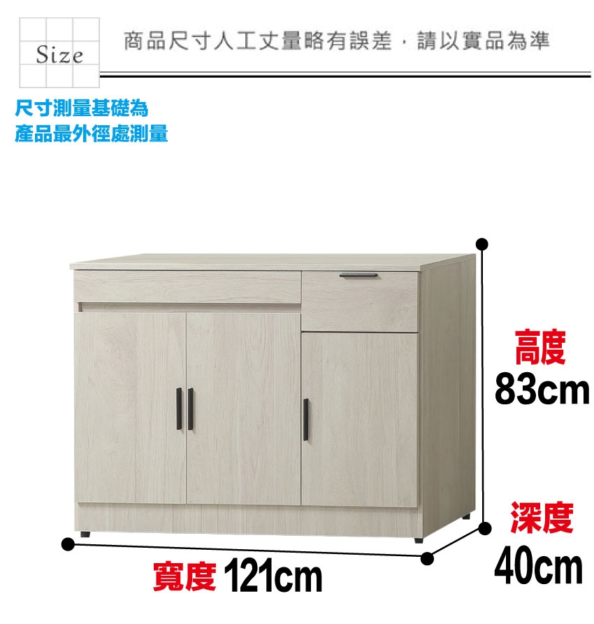 尺寸:(寬)121x(深)40x(高)83/公分 ◆材質: 材質:防蛀木心板+防夾手緩衝門片五金+防潮耐磨底座+五金滑軌結構 噴漆:防潮耐磨噴漆處理 ◎注意事項: 1.接單後,會有專員與您電聯確認送貨時間。 2.需以吊車吊運以當地吊車行情計,費用由消費者支付。 3.備註:本商品不含圖片上、家飾...等,情境圖之內容僅供參考。 4.請於配送人員到場時,檢查商品有無缺失,以免造成爭議。 5.允許的誤差尺寸範圍+-2%。 6.因拍攝燈光與電腦解析度瑩幕不同可能會造成實品與網頁上商品有些許色差,商品以收到實品為主。 ◎收貨與退貨: 1.實因特殊地型限制及(山區、濱海鄉、鎮、村、區)無法送貨時,本公司保有出貨與否之權利(下單後會由專人告知是否可配送)。 2.有電梯不收取費用! 無電梯樓層超過4樓以上(包含4樓)一樓層費用200元,現場支付給服務員。 3.超過鑑賞期,恕不接受退貨。 4.限非人為因素破壞毀損,才可退貨。 5.若退貨時,收件時間請與廠商協調,確保自己權益。 6.退貨時應保留贈品及附件完整(如有遺失部分,需酌收費用)。 ◎備註: .無回收服務。 .收貨與退貨:實因特殊地型限制及(山區、濱海鄉、鎮、村、區)無法送貨時,本公司保有出貨與否之權利(下單後會由專人告知是否可配送)。 .花蓮(縣市)、台東(縣市)、屏東(縣市場及其它縣市屬於山區、濱海鄉、鎮、村地區無配送服務,如您有需求,則需另外收取運費。(您可直接訂購,後續由廠商報價。) ※由於加價配送服務為一次消耗性商品,若有退換貨等情形加購之運費恕無法退還 ※運費報價皆為單趟計算。 ※使用加價配送地區,收貨時間會比一般地區再增加10個工作天。