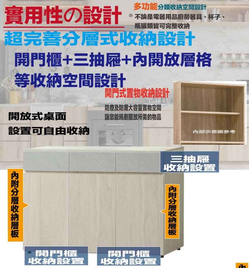 搭配採用開門櫃+三抽屜+內開放層格等收納空間設計