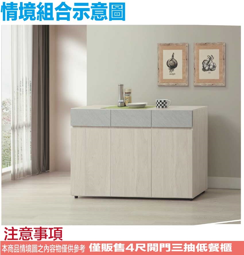 ★偏遠地區需額外加收運費,下標請先問與答詢問★ ★下訂前注意 由於商品流動較快,下訂前請先詢問是否有貨在下訂喔~★ 【綠家居】莫森4尺三門三抽低餐櫃 現代雙色系+安心材質製造,使用放心+搭配居家更便利,採用防蛀木心板+防潮耐磨底座+防夾手緩衝門片五金+五金滑軌結構等安心材質製造 ,外層採用防潮耐磨噴漆處理搭配採用開門櫃+三抽屜+內開放層格等收納空間設計,全由專人配送到家,專業安心服務,替你省下更多時間!