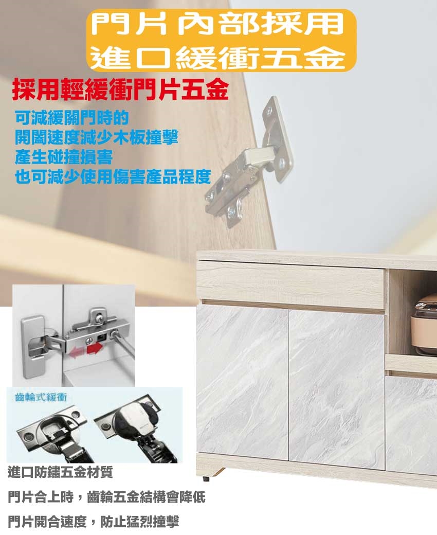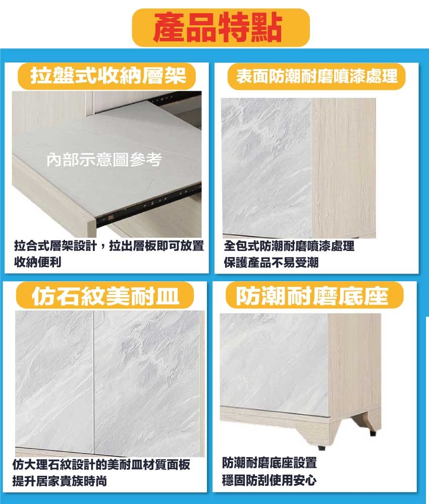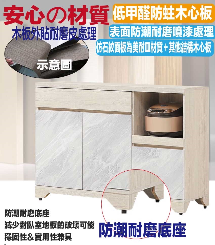 材質:防蛀木心板+五金滑軌結構+防刮耐磨腳座+仿石紋耐磨美耐皿材質面板+防夾手緩衝門片五金