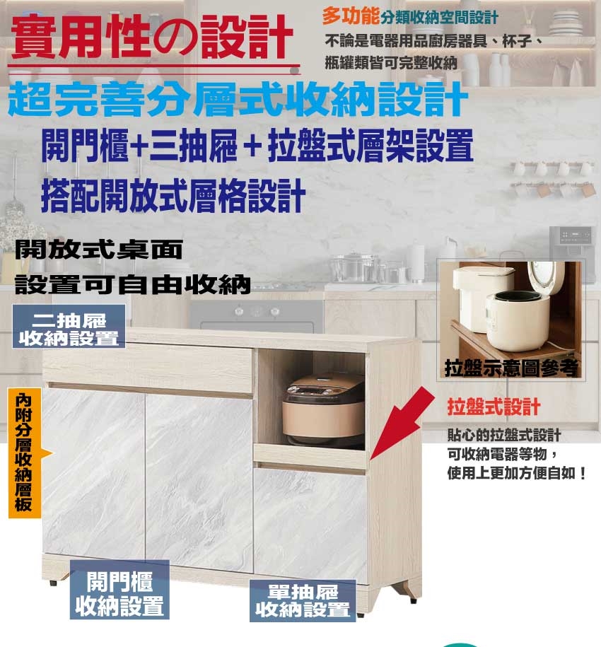 搭配採用開門櫃+二抽屜+內&外開放層格+拉盤層架等收納空間設計