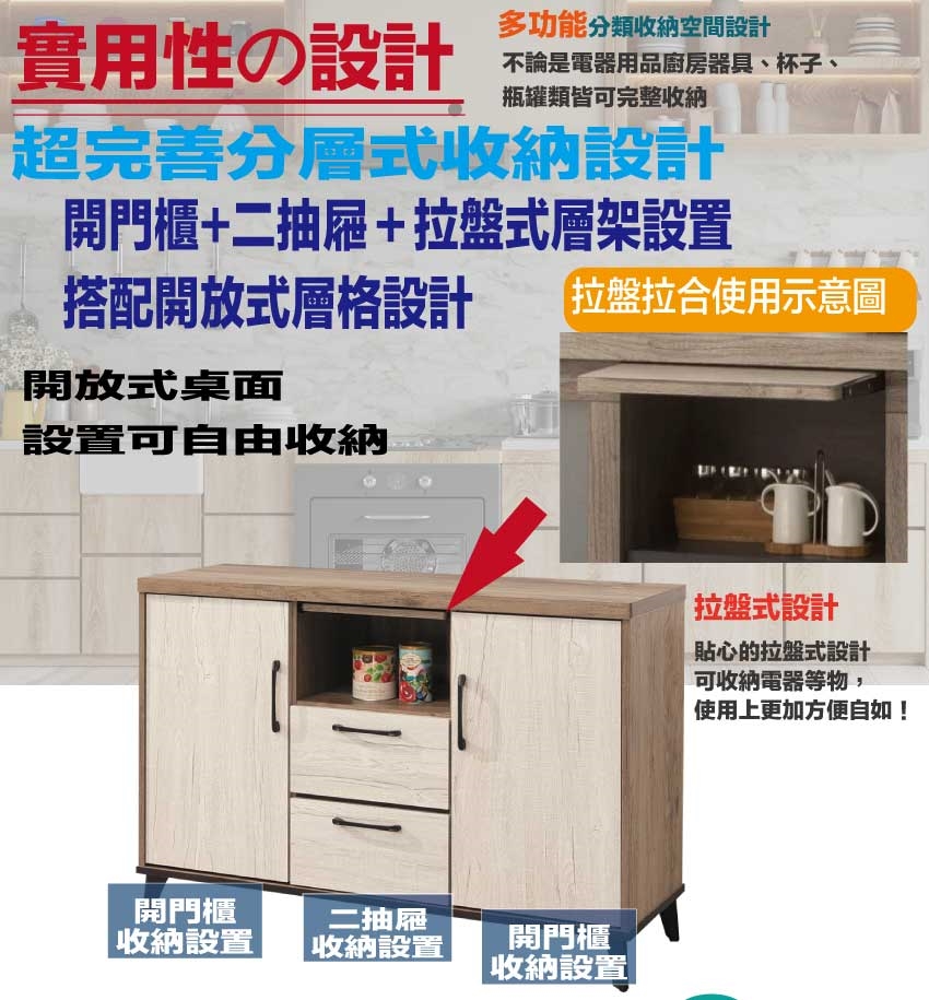 搭配採用開門櫃+二抽屜+開放層格+拉盤層架等收納空間設計